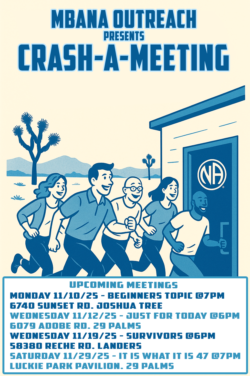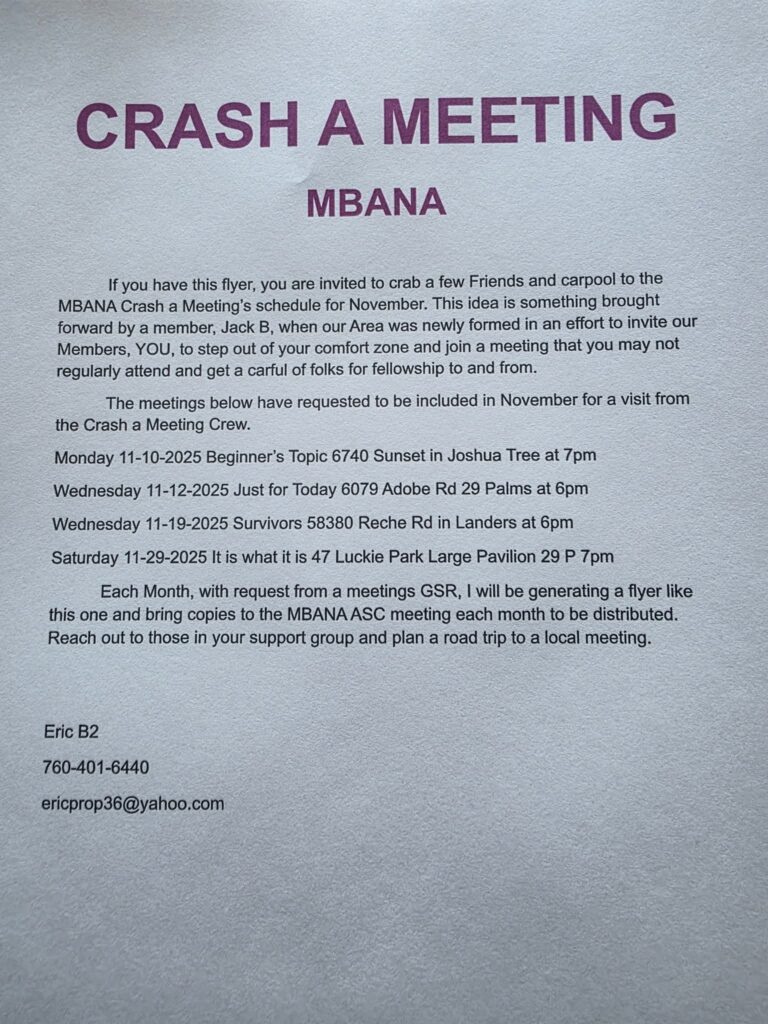 If you have this flyer, you are invited to grab a few Friends and carpool to the MBANA Crash a Meeting’s schedule for November. This idea is something brought forward by a member, Jack B, when our Area was newly formed in an effort to invite our Members, YOU, to step out of your comfort zone and join a meeting that you may not regularly attend and get a car full of folks for fellowship to and from. The meetings below have requested to be included in November for a visit from the Crash a Meeting Crew.